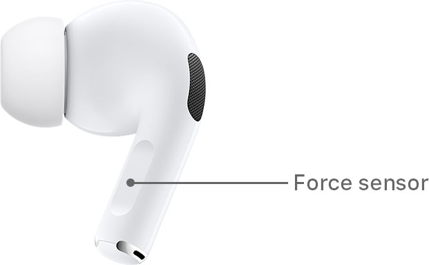 AirPods Pro have a “force sensor” on the stem to switch between active noise cancellation and Transparency mode. Press the force sensor once to play, pause, or answer a phone call; press twice to skip forward; press three times to skip back; and press and hold to switch between the listening modes.