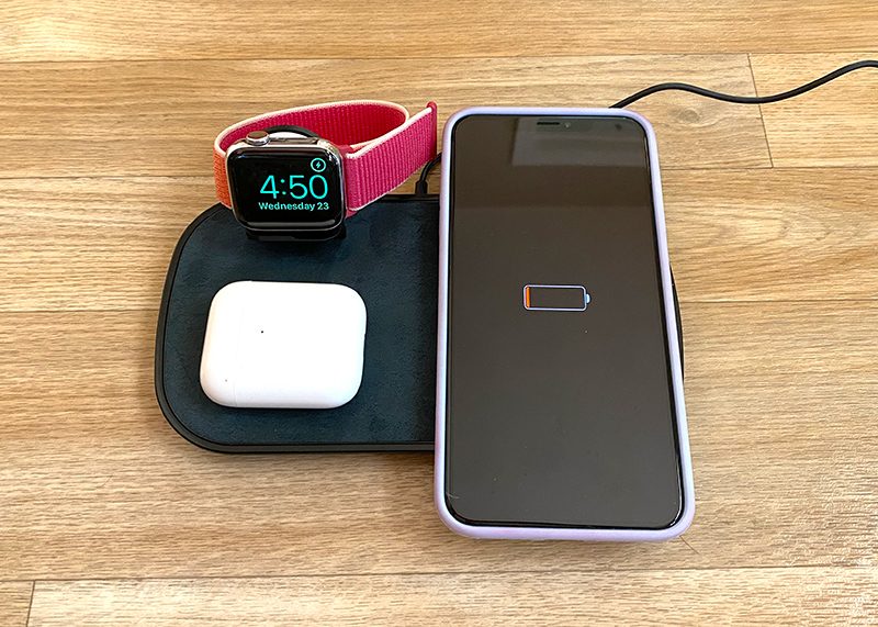 Both the AirPods and AirPods Pro come with charging cases that provide additional charges for more than 24 hours of total listening time and more than 18 hours of total talk time. AirPods Pro have a wider charging case to accommodate the ear tips, but the battery does not appear to be much larger.